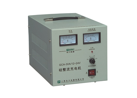 GCA系列充電機(jī)是由隔離變壓器、整流器件、電壓轉(zhuǎn)換和充電電流 調(diào)節(jié)開關(guān)所組成。是一種簡(jiǎn)易型充電機(jī)。市電通過隔離變壓器降壓后經(jīng) 橋式整流(或全波整流)為脈動(dòng)直流電對(duì)電瓶充電,充電時(shí)需要人工選 擇充電電壓和電流。具有結(jié)構(gòu)簡(jiǎn)單可靠、經(jīng)濟(jì)實(shí)用的特點(diǎn)。